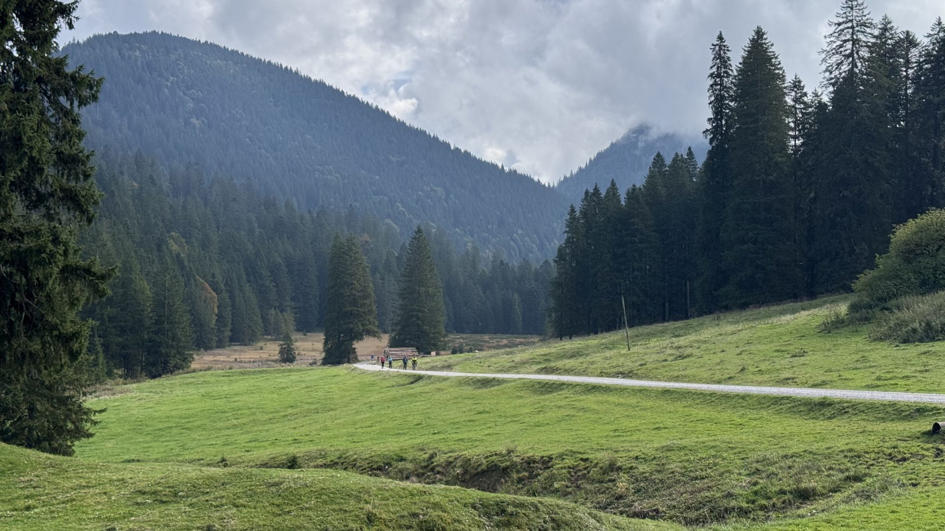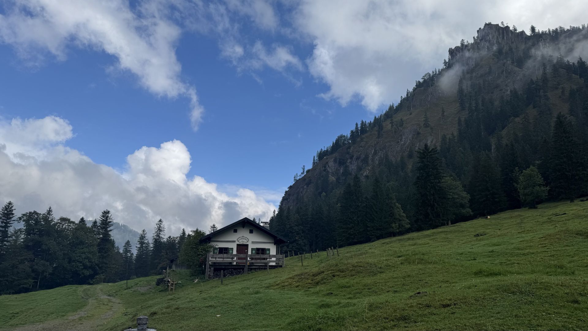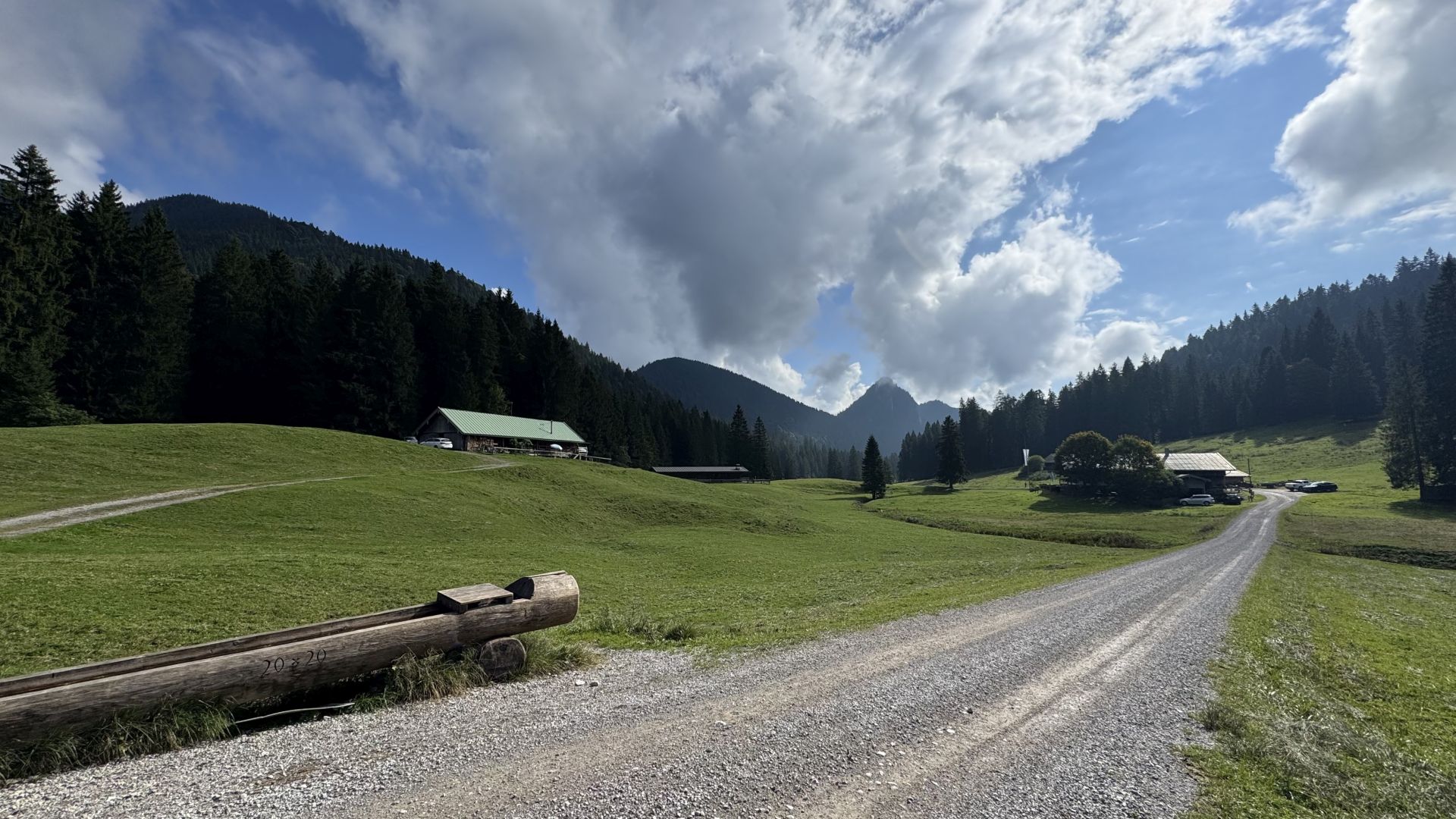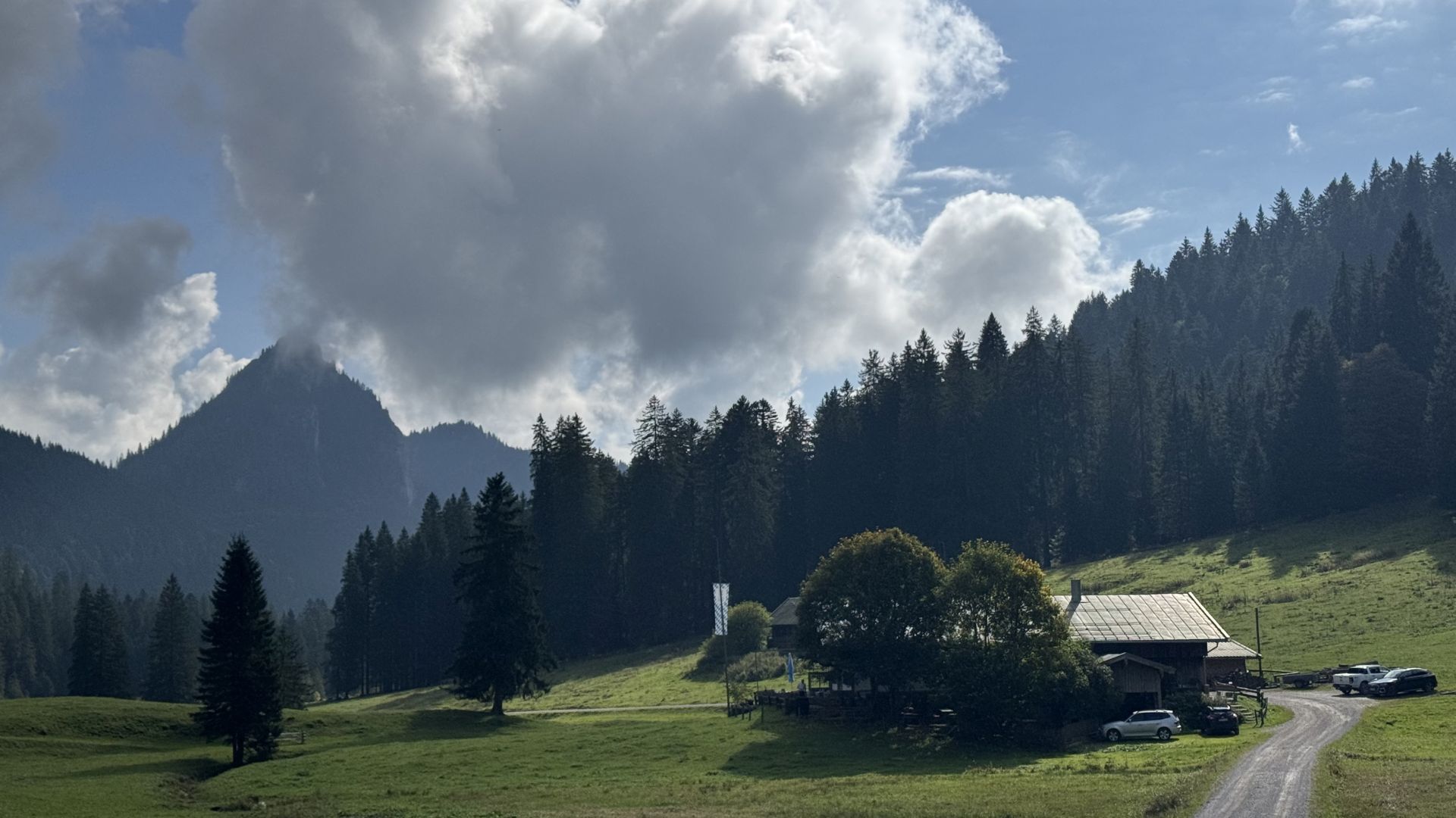 Die weitere Strecke war alles andere als eben, womit sich auch die insgesamt 800 Höhenmeter erklären. Aber die Einkehr bei der Käselam Schönegg hat mit hervorragender Aussicht voll entschädigt. Da die Schlangen bei der Brotzeitausgabe recht lang waren, haben wir uns entsprechend auch über eine Stunde aufgehalten, bevor es steil die Wiese hinunter zur Echelsbacher Brücke und oberhalb des Bayersoiener Sees wieder zurück nach Bad Kohlgrub ging.