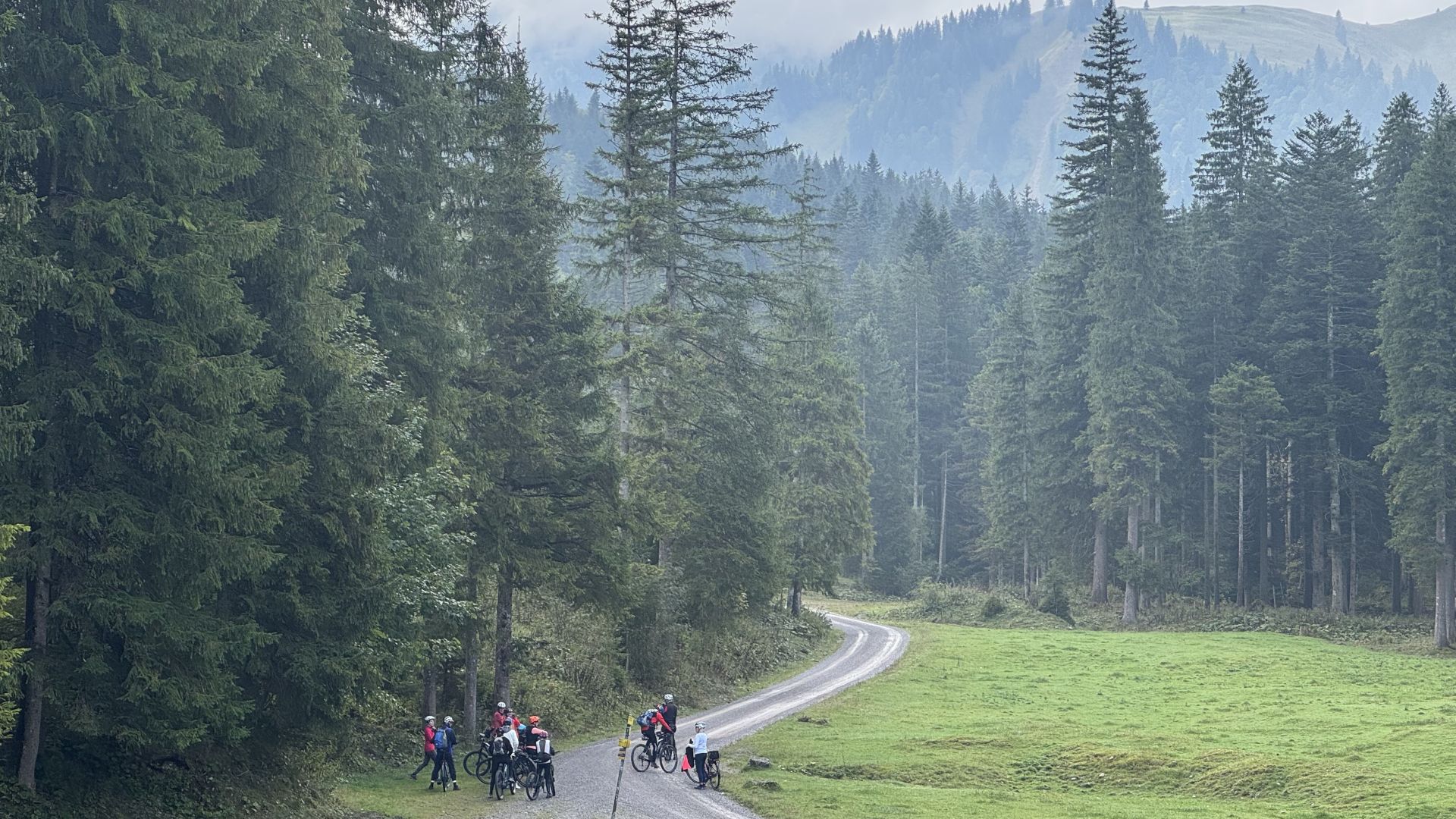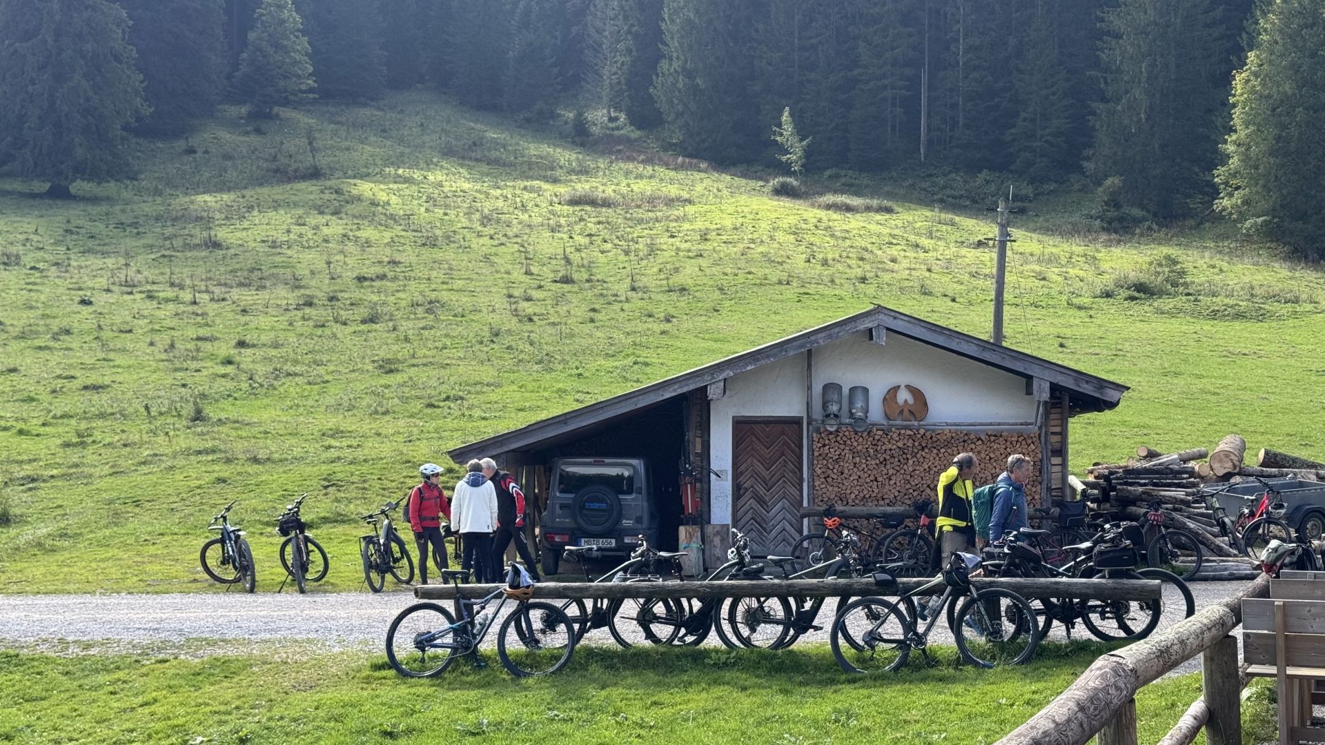 Wir (12 Naturfreunde und ein Gast) starteten am Parkplatz im Söllbachtal und fuhren mit den Rädern stetig leicht ansteigend bergauf. Es war recht schattig und kühl bedingt durch den Söllbach, jedoch wurde uns beim Radeln bald warm. Rechterhand konnten wir den Roß- und Buchstein sehen. Der Schlußanstieg war recht schweißtreibend, jedoch kam bald darauf die Schwarzentennalm in Sicht, wo wir eine kleine Pause einlegten. Die Sonne stibitzte mittlerweile ab und an heraus. Die lange schotterige Abfahrt bis zum Parkplatz Winterstube fuhr jeder in seinem eigenen Tempo.