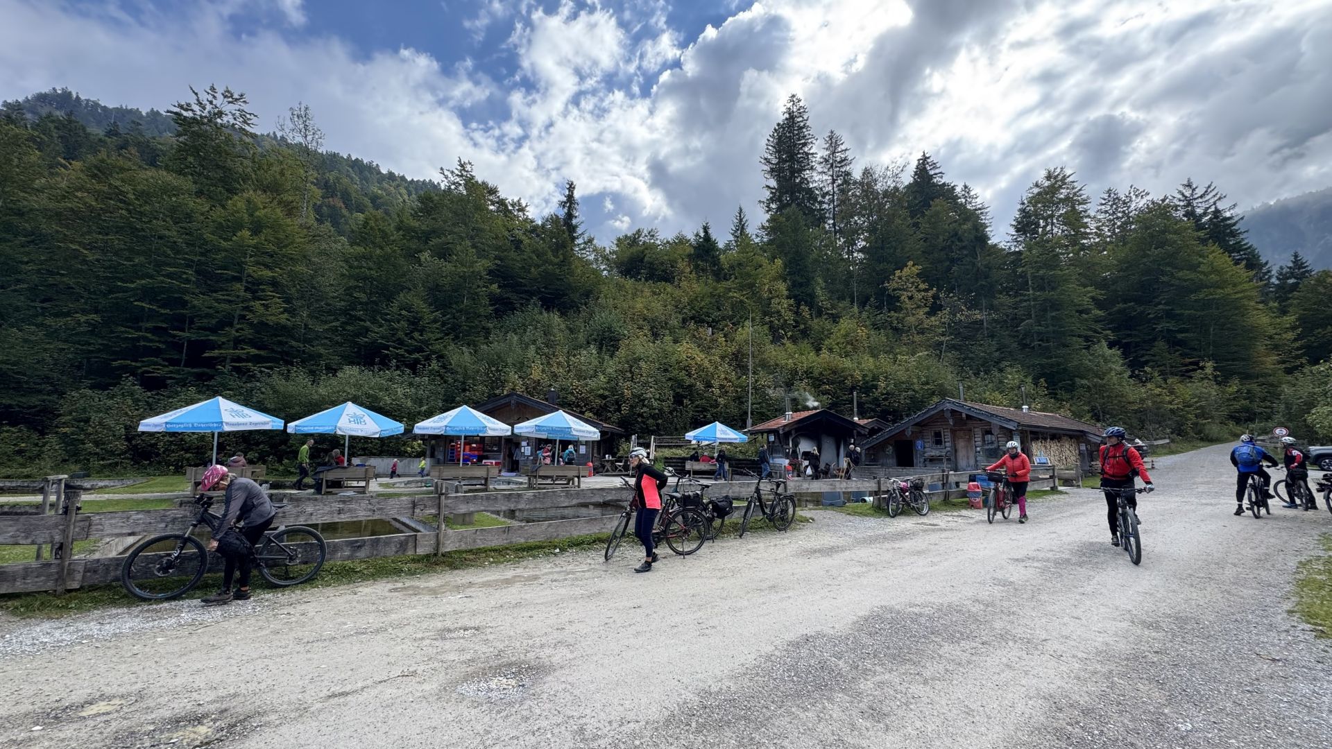Da es am Sonntagvormittag absehbar noch regnen würde, haben wir den Start dieser klassischen Tour auf 12:00 Uhr mittags verschoben. So sind wir dann zu sechst (davon 1 Gast) gegen 13:00 Uhr am Forsthaus Unternogg bei Unterammergau angekommen. Zum Abladen der Räder haben wir noch die restlichen Regentropfen mitbekommen, aber schon 10 Minuten nach dem Start konnten wir die Regensachen schon wieder verstauen. Die ersten 6-7 km ging es ca. 350 Hm bergauf bis zur Wasserscheide von Halblech und Halbammer. Dem Halblech sind wir schließlich stetig bergab bis ins Tal gefolgt, von dort nunmehr im strahlenden Sonnenschein bis zu unserer Einkehr an der Almstube Trauchgau.