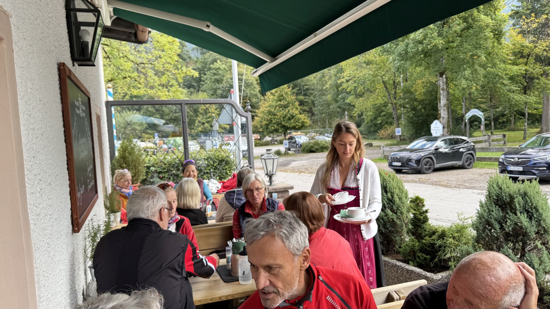 Es ging dann gemütlich an der Weißach entlang und wir kamen bald an der Herzoglichen Fischzucht in Wildbad Kreuth vorbei, wo Forellen, Saiblinge und Äschen gezüchtet werden sowie an der Hanns-Seidel-Stiftung, in der früher die CSU ihre Klausurtagungen abhielt. In Kreuth ließen wir es uns im Gasthof Batznhäusl im Biergarten schmecken.