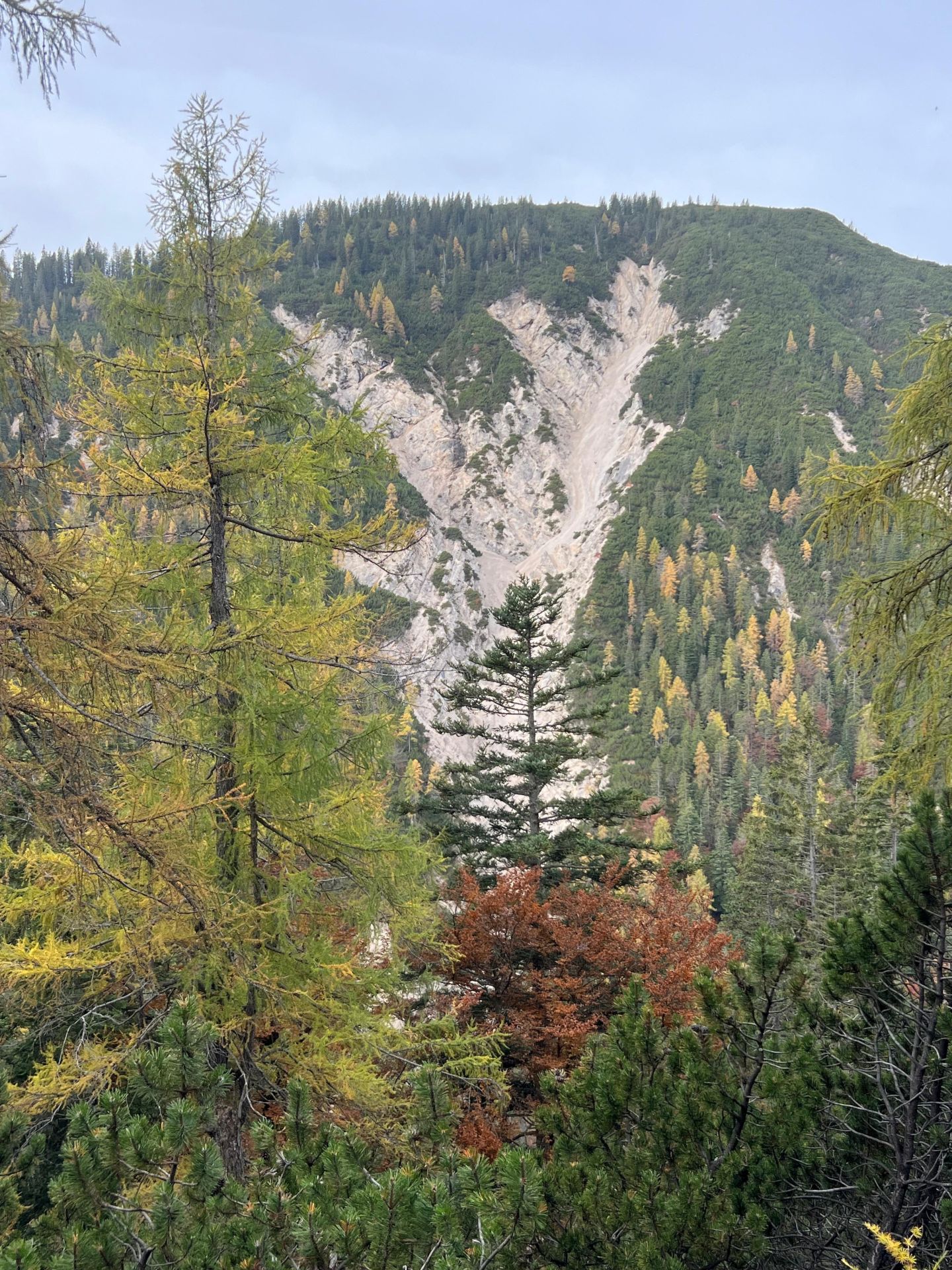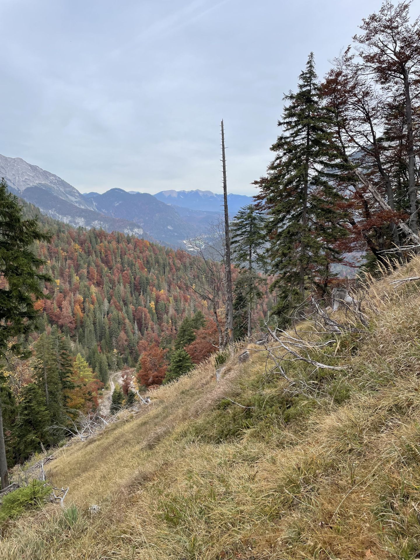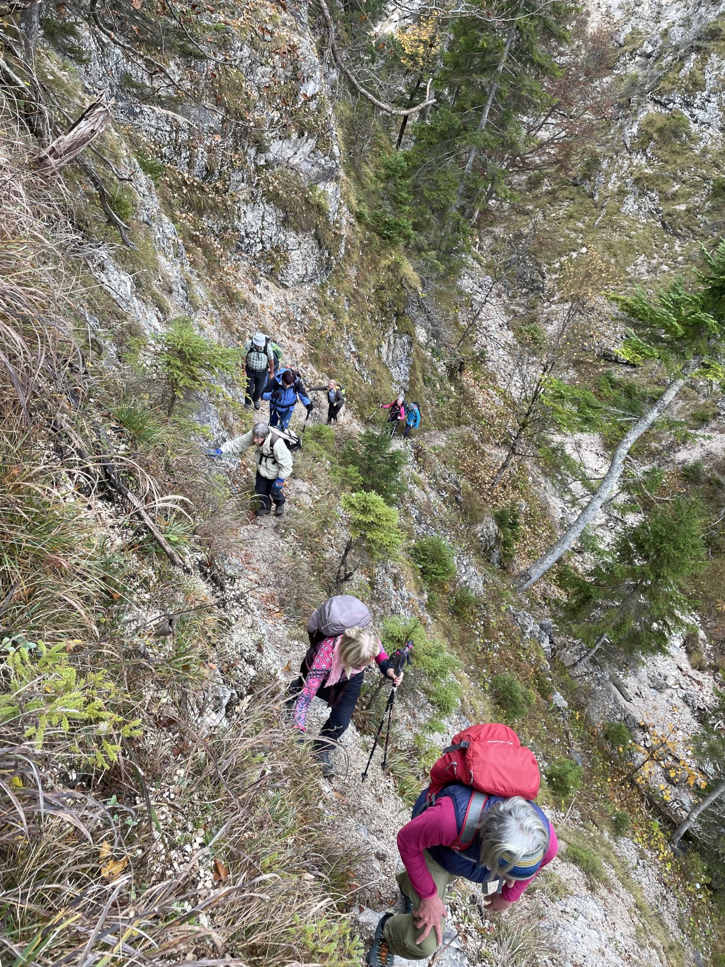 Der Abstieg erforderte nochmal unsere ganze Aufmerksamkeit, denn die erste Wegstrecke führte über schlottrige Felsrinnen richtig steil bergab. Weiter über den Mittagskopf und den Mühlberg, aber im gemächlichen Gefälle liefen wir Richtung Scharnitz. Auf einem schönem Waldpfad abwärts, ein kurzer Blick in die tiefe Bärenklamm und schon waren wir wieder am Ausgangspunkt angelangt.