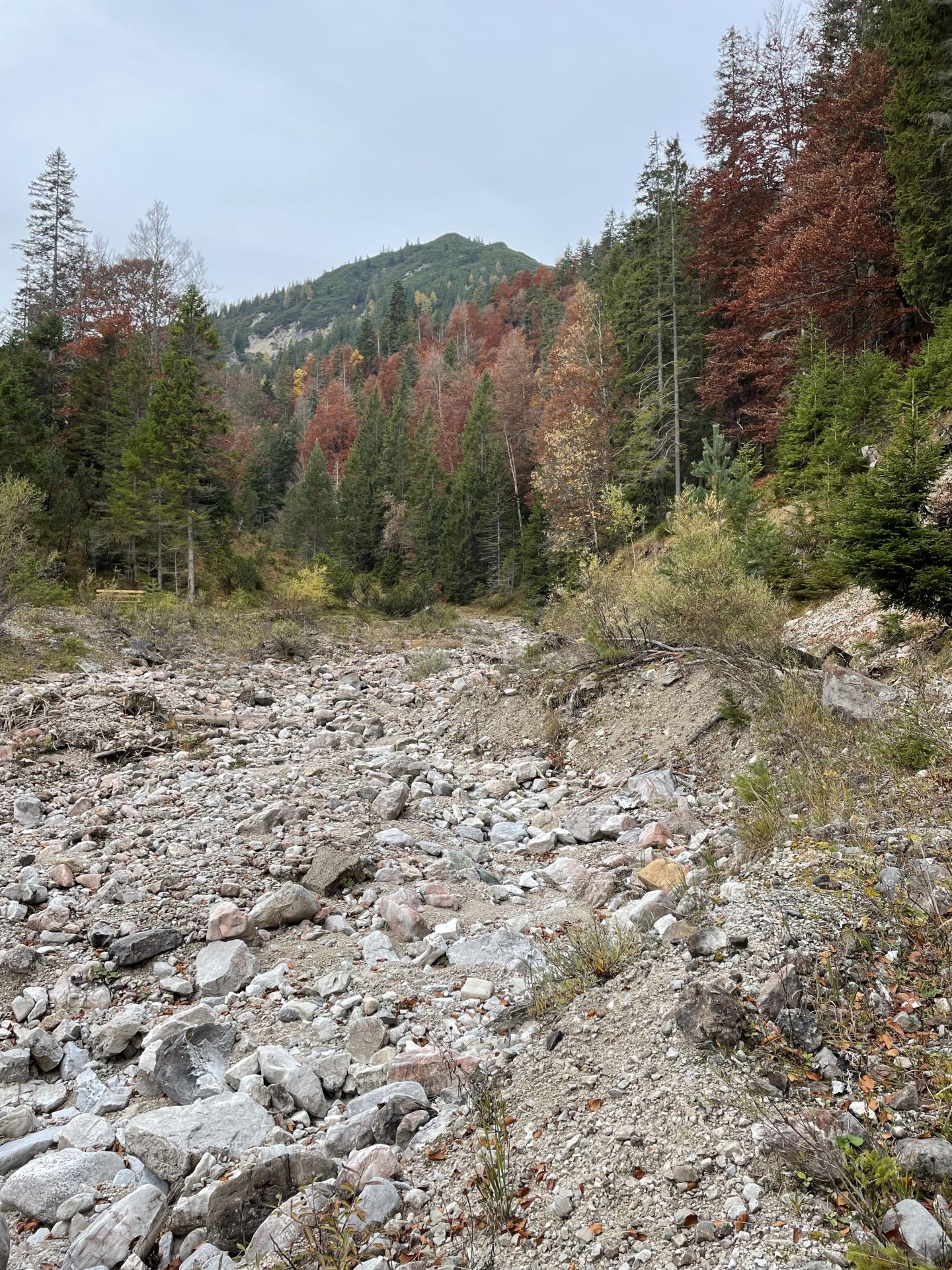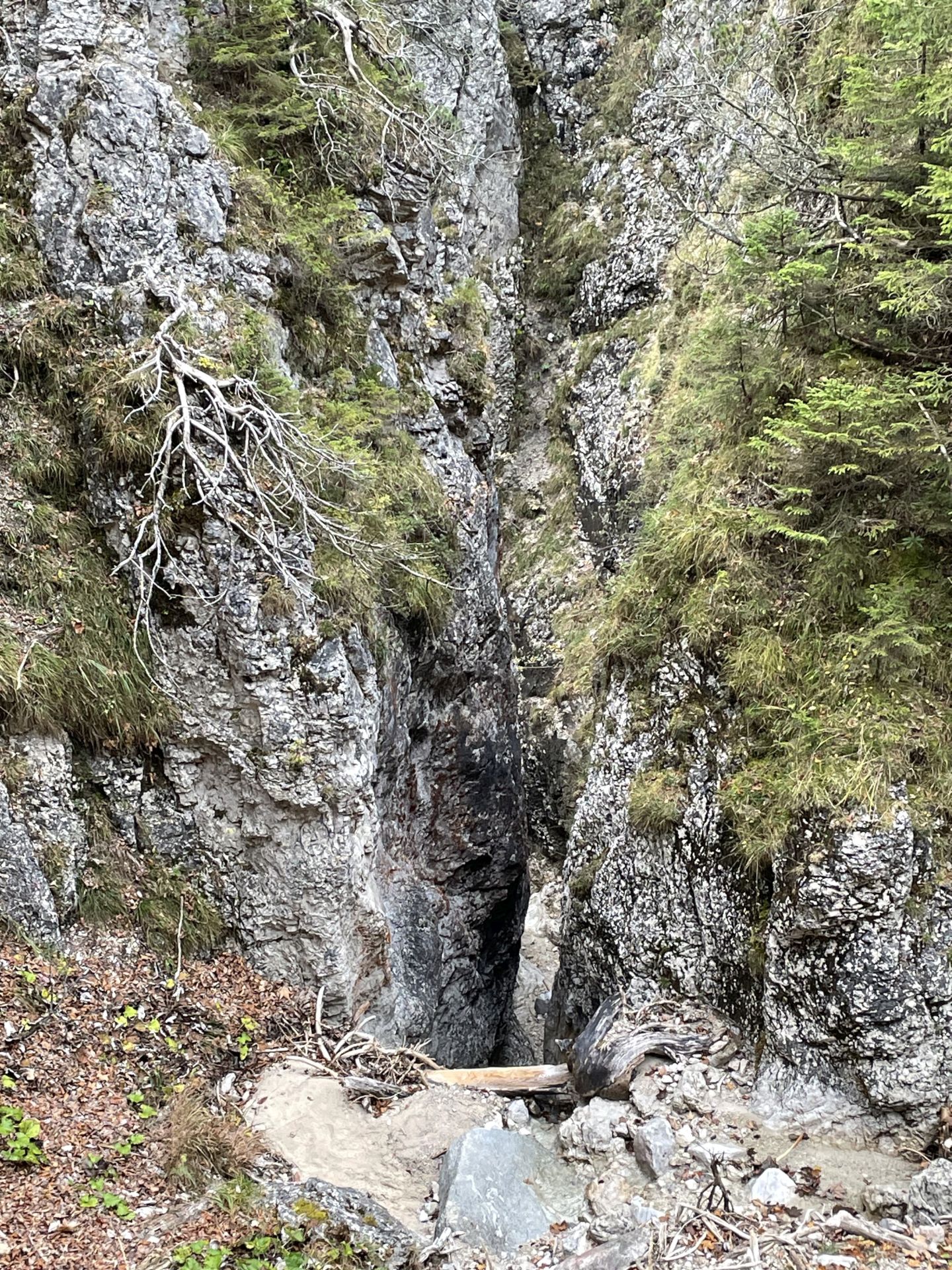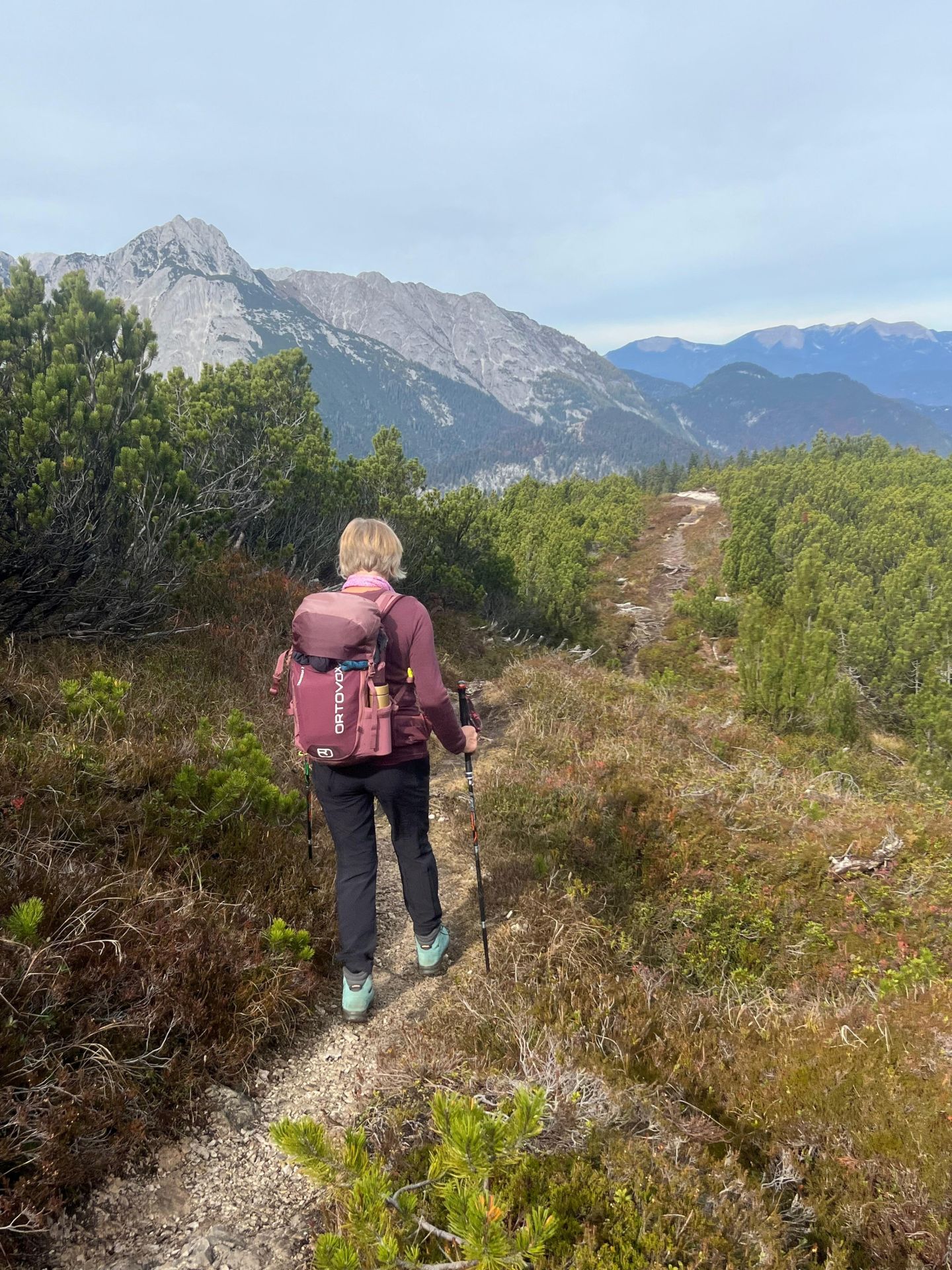 Der Abstieg erforderte nochmal unsere ganze Aufmerksamkeit, denn die erste Wegstrecke führte über schlottrige Felsrinnen richtig steil bergab. Weiter über den Mittagskopf und den Mühlberg, aber im gemächlichen Gefälle liefen wir Richtung Scharnitz. Auf einem schönem Waldpfad abwärts, ein kurzer Blick in die tiefe Bärenklamm und schon waren wir wieder am Ausgangspunkt angelangt.