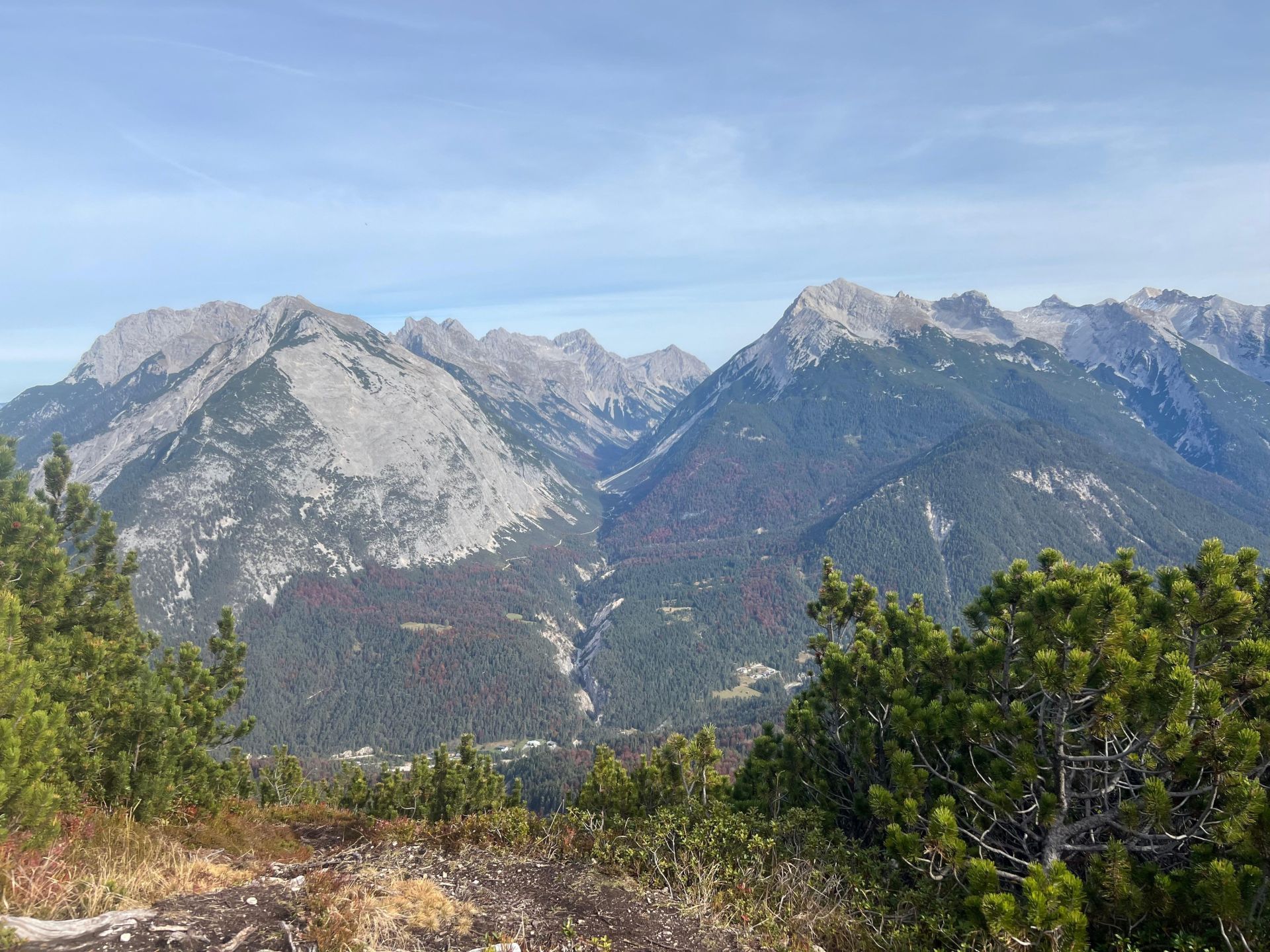 Nach einer ausgiebigen Pause mussten wir noch rund 200 Hm zurücklegen, um auf dem Zäunlkopf endlich die Rundumsicht auf den hohen Gleirsch, die Pleisenspitze zu genießen. Ein paar Minuten später konnten wir dann an der „Schönen Aussicht“ die Blicke in alle Richtungen schweifen lassen.