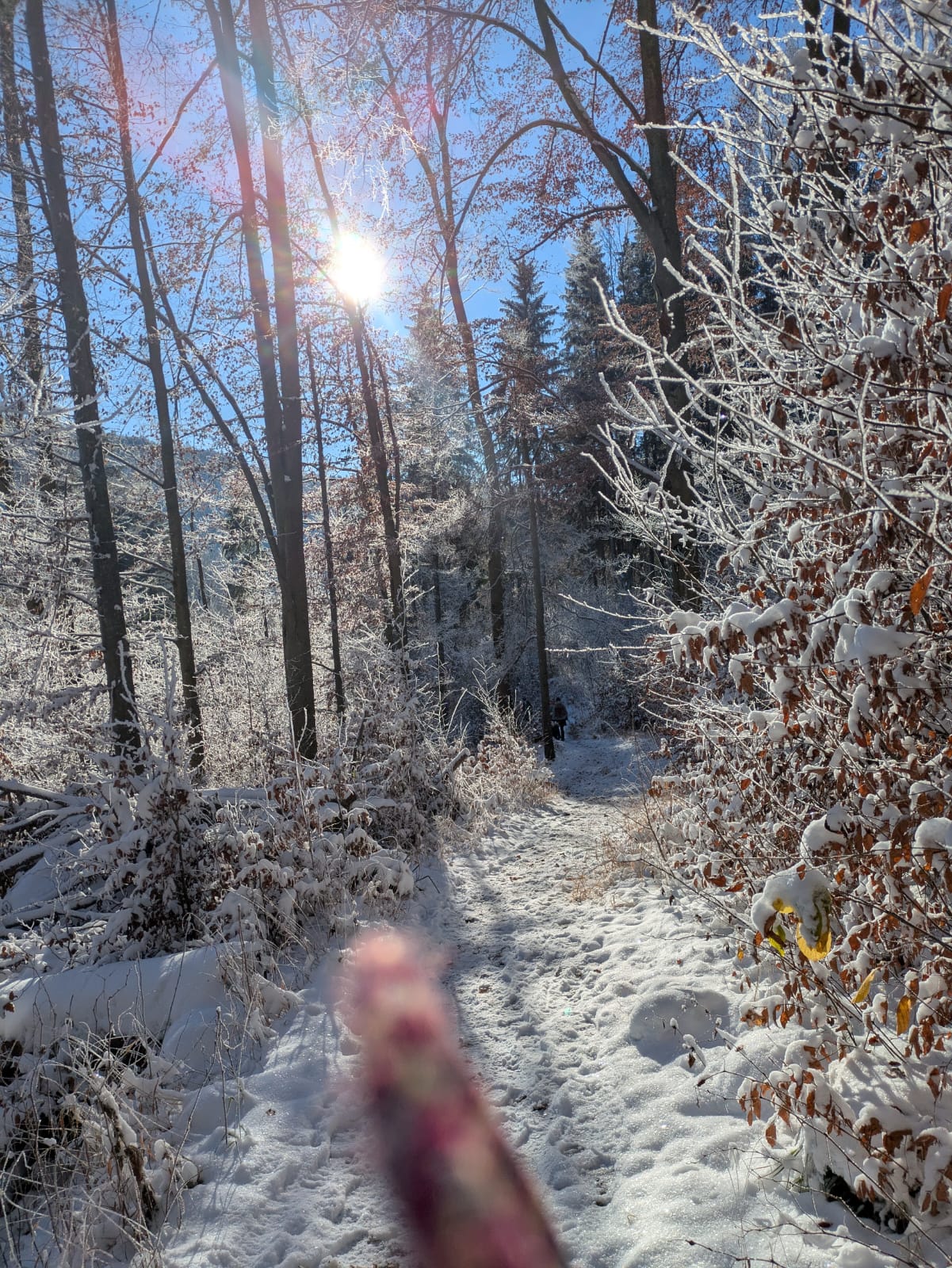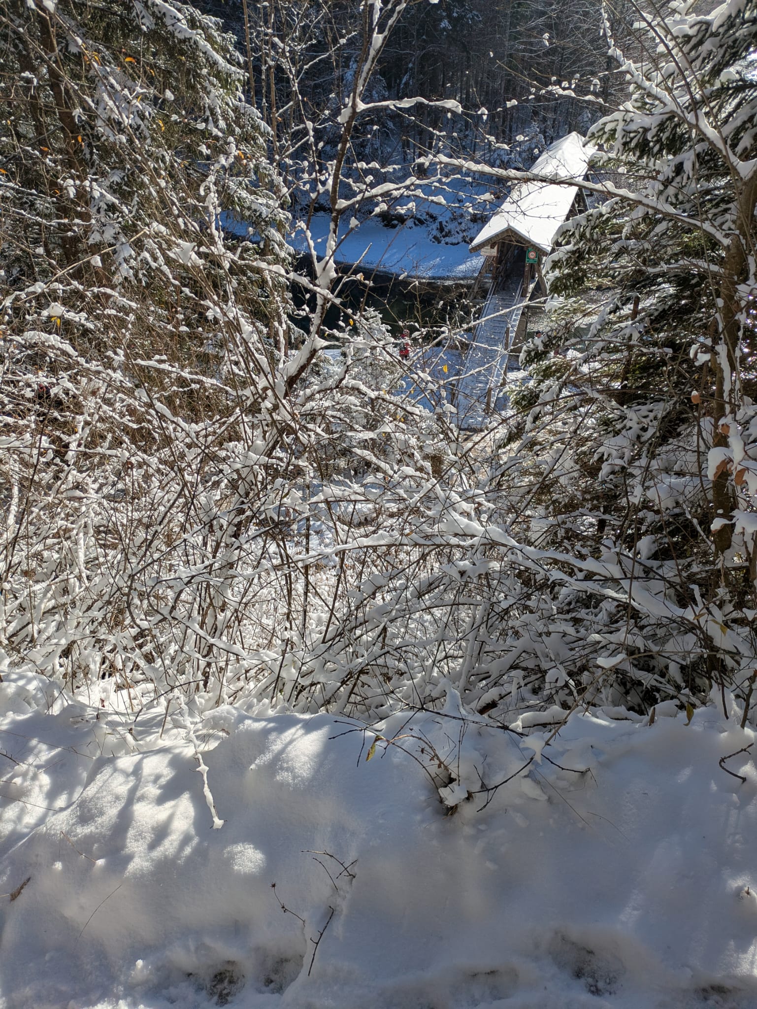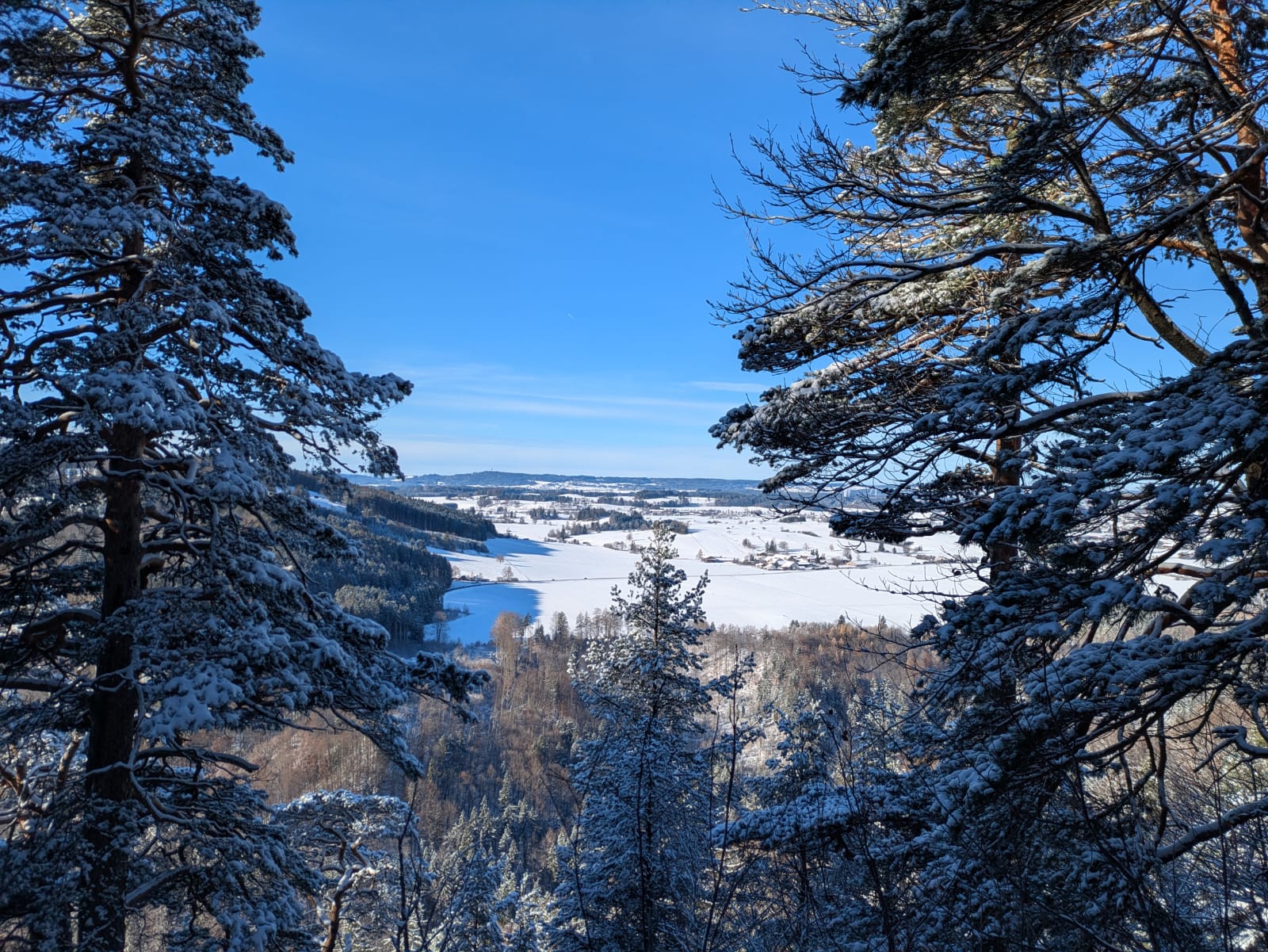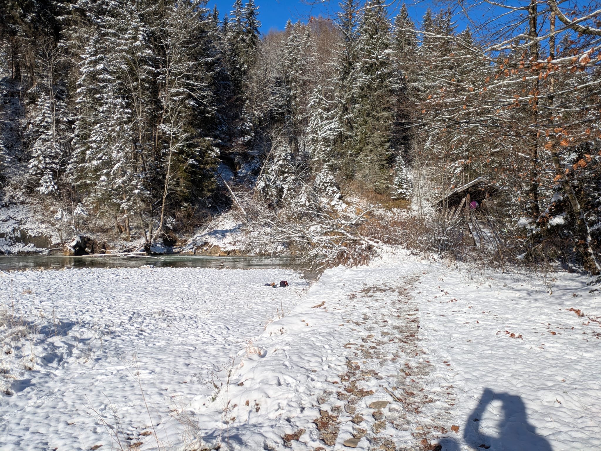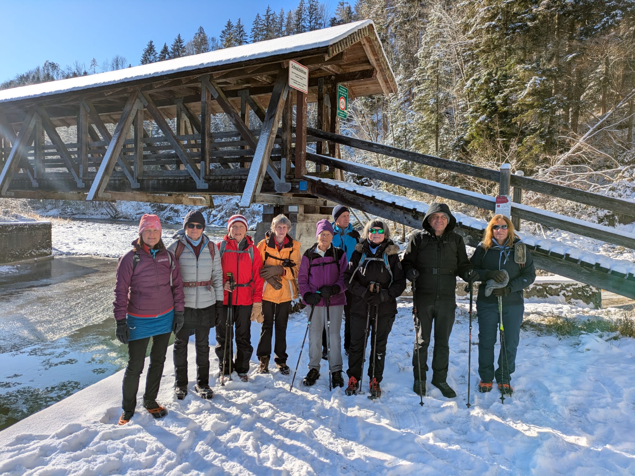 In Peiting angekommen ging es durch zauberhaft verschneiten Wald mit den Grödln an den Bergschuhen bergab zur Ammerschlucht. Als wir die Ammer auf der Holzbrücke überquerten konnten wir eine "Eisschwimmerin" bewundern, kein Vogel - eine junge Frau! Unser teilweise steiler Aufstieg zum Schnalzberg wurde mit angenehmer Sonneneinstrahlung und grandiosen Bergblick belohnt.