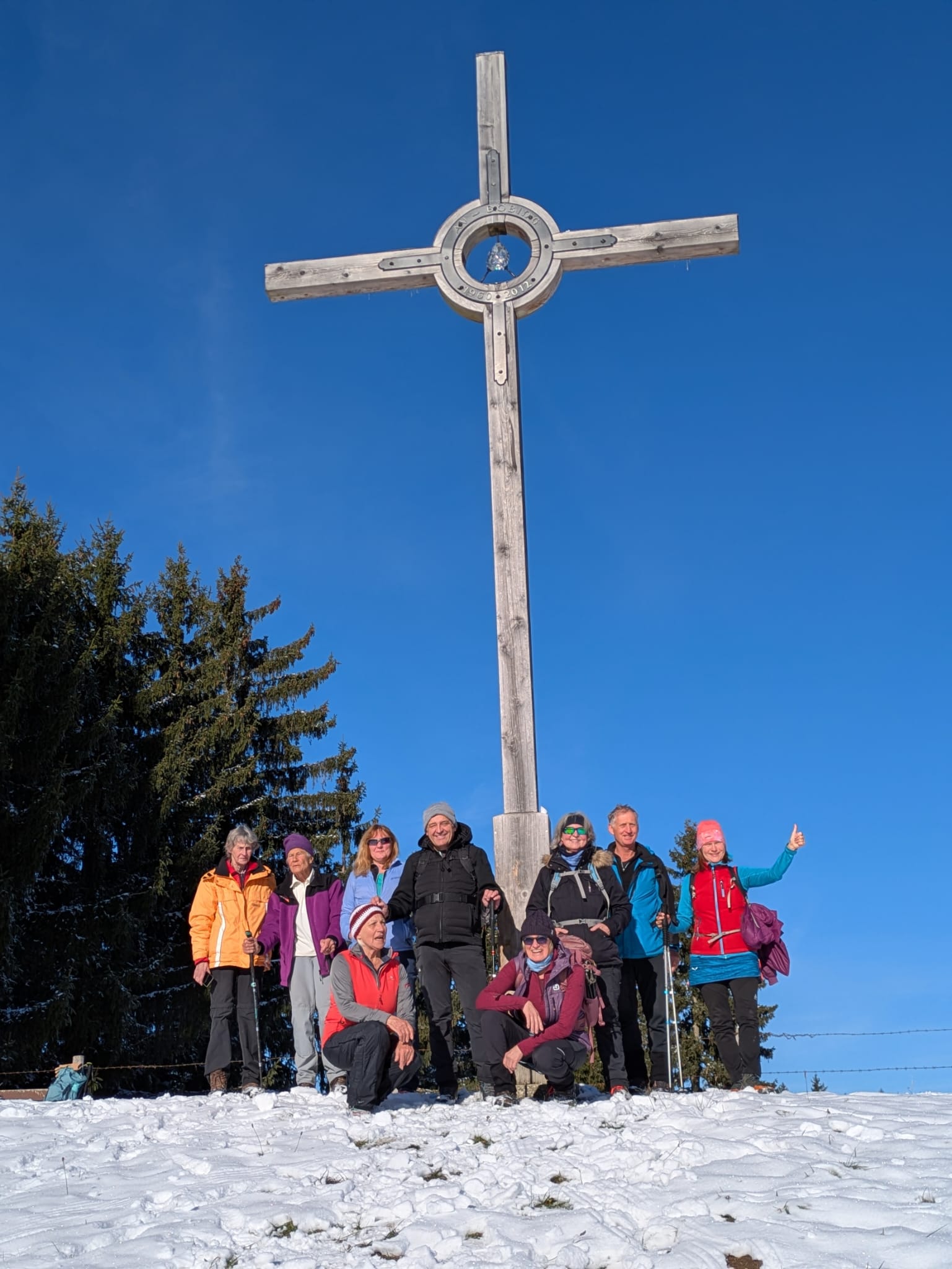Am Gipfelkreuz die wohlverdiente Rast und dann der Abstieg auf der anderen Seite hinunter zu einer Forststraße und wieder zu unserem Aufstiegsweg und zurück zu dem Wanderparkplatz in Peiting.