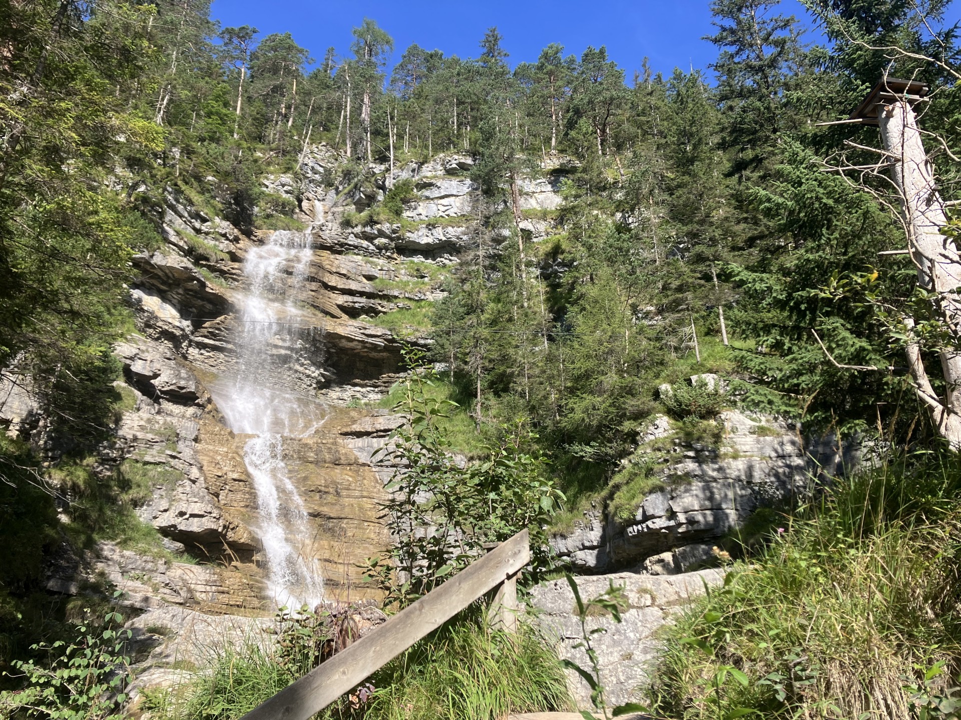 Nach ca. 8 km kamen wir bei Seewinkl an den Plansee, wo unser erstes Gruppenfoto entstand. Manch einer konnte es sich hier schon kaum verkneifen, schwimmen zu gehen. Aber die Pause war erst später angedacht. Somit fuhren wir weiter, erst entlang des Campingplatzes mit Badestrand am östlichen Teil des Plansees entlang, dann ca. 4 km auf der gut befahrenen Straße in westlicher Richtung, bis wir links auf eine kleine Holzbrücke abbogen. Ab hier war für ca. 1,5 km besondere Vorsicht geboten, erstens wegen der Fußgänger und entgegenkommenden Radler als auch weil der Weg z.T. schmal und wurzelig ist. Wir überquerten wieder eine Brücke, die den Plansee vom Heiterwangersee trennt. Hier legten wir unseren Badestopp ein und machten Brotzeit. Immerhin zwei unserer Radler wagten sich komplett in den doch recht kalten See. Das Panorama inmitten der Berge war überwältigend. Es war ein wunderbarer Tag, doch die Hitze ließ uns ganz schön schwitzen. Nach der Erfrischung ging es am Heiterwangersee entlang des Zugspitz-Panoramaweges mit ein paar Steigungen auf Schotterwegen vorbei an Bichlbach bis zu unserer Einkehr in Lähn, dem höchsten Punkt unserer schönen Tour. Hier ließen wir uns die Erfrischungsgetränke und das Essen gut schmecken. Ab Lähn ging es ganz entspannt auf dem Radlweg vorbei an Lermoos mit wunderbarem Blick auf das Zugspitzmassiv. Bei Ehrwald bogen wir links ab und legten einen letzten Foto- und Genussstop beim „Häselgehrwasserfall“ ein.