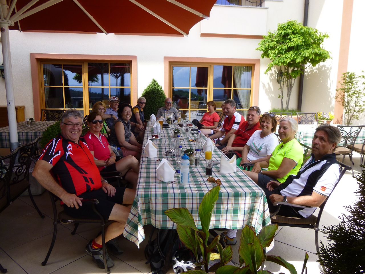 Tag 2 – Sonntag: voller Erwartung und bei optimalem Wetter starteten wir unsere erste Radltour Richtung Bad Kötzting und durchfuhren viele kleine Orte. Die Mittagsrast verbrachten wir in einem noblen Hotel auf der Terrasse und genossen die Aussicht. Dann ging es wieder zurück. Zwischendurch wurde bei dem einen oder anderen Radl die Luft nachgepumpt. Ansonsten gab es keine Zwischenfälle. Allerdings wurden es ein paar Höhenmeter mehr als geplant, was aber niemandem Probleme bereitete.