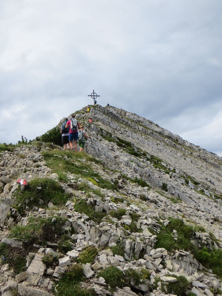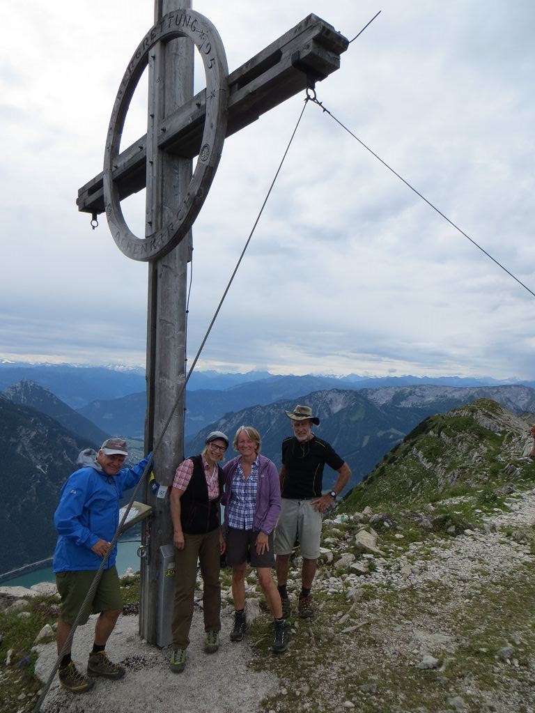 Vom Parklplatz in Achenkirch 931 m, am Campingplatz, ging es nur am Beginn gemütlich über den Oberaubach über einen Forstweg aufwärts. Bald aber stieg es steiler an bis zur Seekaralm auf 1500m. Spätestens nach der Baumgrenze wurde es immer felsiger und stellenweise mussten wir auch unsere Hände zur Hilfe nehmen. Nach einer kurzen Verschnaufpause erklommen wir dann mit kurzen Blicken auf den Achensee und die umliegenden Berge, die Seekarspitze 2085m. Während der dringend notwendigen Brotzeit nach 3 Stunden Gehzeit, bestaunten wir das herrliche Panorama, das erste Etappenziel war glücklich erreicht.