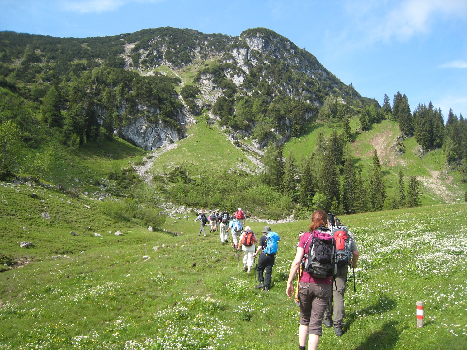 Wir hätten unsere Tour mit dem Ende beginnen sollen. Einem herrlichen Biergarten mit Schatten spendenden Kastanien und Lindenbäumen. Einem langem Tisch, für zwanzig Naturfreunde-Bergsteiger liebevoll hergerichtet, und freundlichen Bedienungen, die nur darauf warteten, uns von der köstlichen Himbeer- Joghurt Torte, dem Blaubeerkuchen, der Rote Wand Torte, dem Rhabarber Streuselkuchen und der Erdbeertorte große Stücke bringen zu dürfen. Auch die deftigeren Speisen sahen verlockend aus. Doch jedes Vergnügen sollte erst verdient werden darum Ackernalm, Aufstieg durch den Fuchsgraben, steil, rutschig und äußerst schweißtreibend. Thalerjoch, Frechjoch dann Veitsberg waren unsere Ziele, alle so gut 1770 Meter hoch. Dazwischen reichliche Sonnenbäder und viele Bergblumen. Blau blühte der Enzian. Zurück ging es über die Grabenbergalm und dann siehe Anfang.