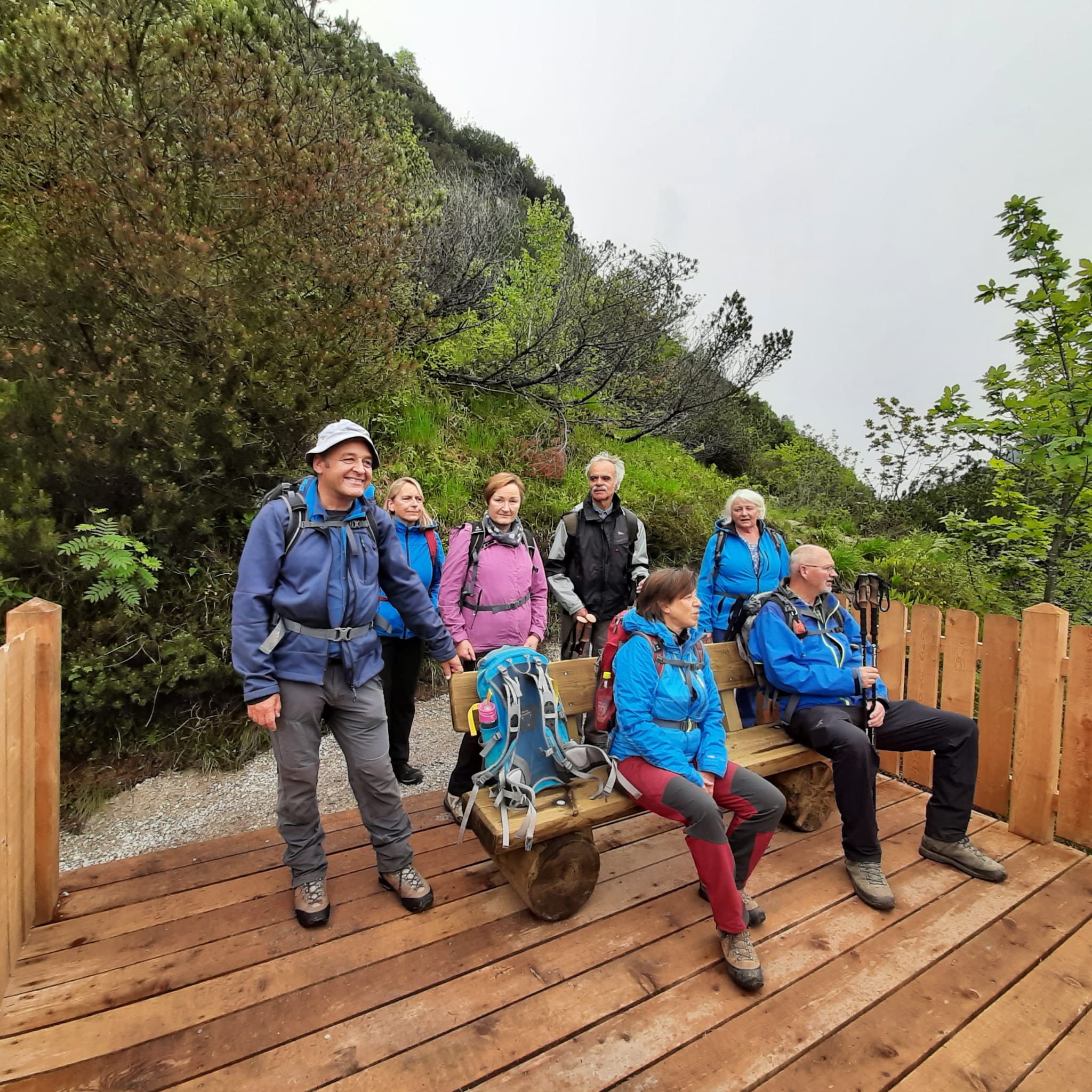 Von der Schiffanlegestelle Scholastika wandern 10 Naturfreunde am Uferweg von Achenkirch nach Pertisau. Bei bewölktem Himmel, aber angenehmen Temperaturen gehen wir auf idyllischen Wegen entlang des Ufers an Ruhebänke und Aussichtsplattformen vorbei, ein ständiges Auf und Ab, mal über künstliche Treppen, mal an Drahtseil gesicherten Hängen. An der türkisblauen Farbe, in der der Achensee mitunter leuchtet, kann man sich nicht sattsehen. Die vielen schönen Blumen am Uferweg beeindrucken uns. Es sind haufenweise Maiglöckchen, Enzian, Frauenschuh, Wiesenflockenblumen und viele andere blühende Pflanzen zu sehen. Es sind ungewöhnlich wenige Wanderer unterwegs, gelegentlich fährt ein Schiff an uns vorbei und macht durch sein lautes Schiffshorn auf sich aufmerksam. Nach unzähligen Treppenstufen kommen wir zur beschaulich schön gelegene Gaisalm, Europas einzige Alm, die auf dem Wasserweg erreichbar ist. Hier kehren wir ein und genießen die traumhafte Sicht auf hohe Felswände und den pittoresken See. Die Hälfte des Weges liegt noch vor uns. Es geht bequem und flach am Mariensteig weiter, der hervorragend präpariert ist. Wir überqueren kleine Rinnsale oder Geröllfelder, die von der Seebergspitze herunterkommen. An einer Kiesbank bauen einige von uns fantasievolle Steinmandel. Unter einem Felsvorsprung mit einem urigen Dach, das uns vor einem kleinen Wasserfall schützen soll, bleiben wir kurz stehen und lassen uns von dem glasklaren Wasser einspritzen. Nach ungefähr acht Kilometer Uferweg erreichen wir das verträumt gelegene Pertisau und kehren in Hafennähe in ein Gasthaus ein. Kurz bevor das Schiff ankommt, erreichen wir die Anlegestelle, suchen uns einen schönen Platz auf dem großen Schiff und genießen die entspannte Überfahrt zurück nach Achenkirch. Als wir zurück nach Wolfratshausen fahren, macht es uns auch nichts aus, dass nun der Regen einsetzt, denn unsere Wanderung am schönen Achenseeuferweg konnten wir trockenen Fußes genießen.