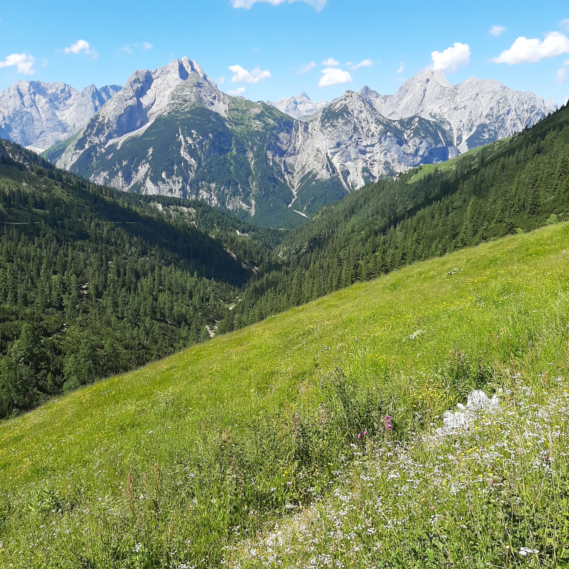 Auf der Plumsjochhütte stärkten wir uns mit Würstl oder Suppe, um die letzten 300 hm bis zum Sattelkreuz zu wandern. Der Aufstieg am Grashang ist von Felsblöcken durchsetzt und wurde zunehmend steiler. Wir waren froh, dass der Wind uns immer ein bisschen ins Gesicht blies. Am Sattelkreuz angekommen machten wir nochmal eine schöne Pause und genossen die wunderbare Rundumaussicht bei bestem Wetter. Die Mondscheinspitze, das Plumsjoch, die Bettlerkarspitze in der Nähe und das Karwendel- und Rofangebirge, auch der Achensee in weiterer Ferne waren sehr gut zu sehen.