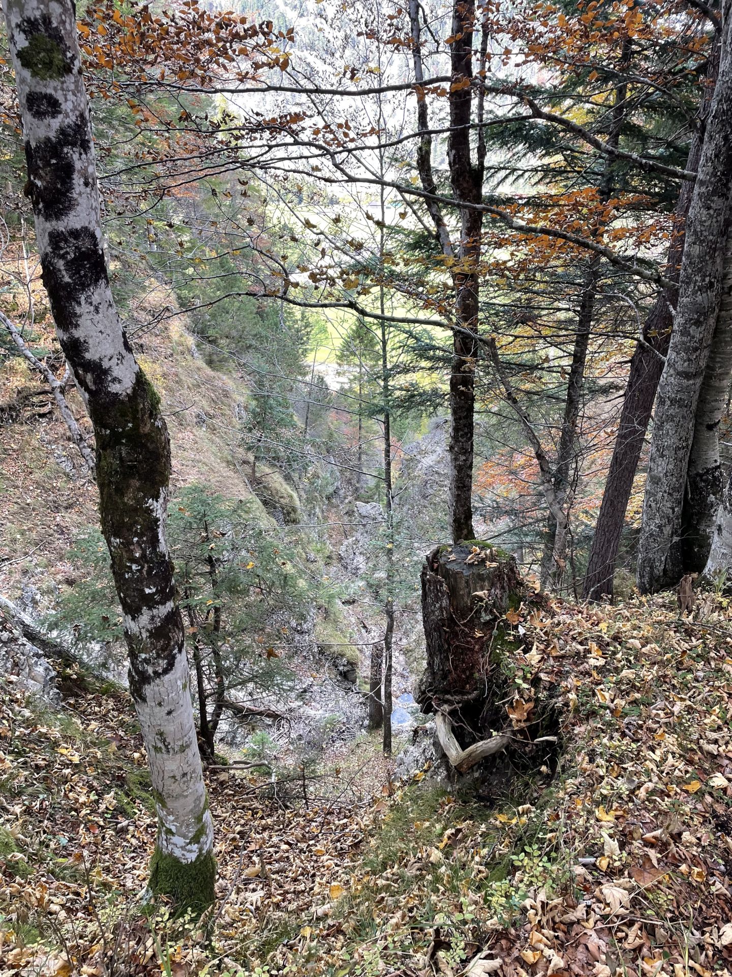 Der Abstieg erforderte nochmal unsere ganze Aufmerksamkeit, denn die erste Wegstrecke führte über schlottrige Felsrinnen richtig steil bergab. Weiter über den Mittagskopf und den Mühlberg, aber im gemächlichen Gefälle liefen wir Richtung Scharnitz. Auf einem schönem Waldpfad abwärts, ein kurzer Blick in die tiefe Bärenklamm und schon waren wir wieder am Ausgangspunkt angelangt.