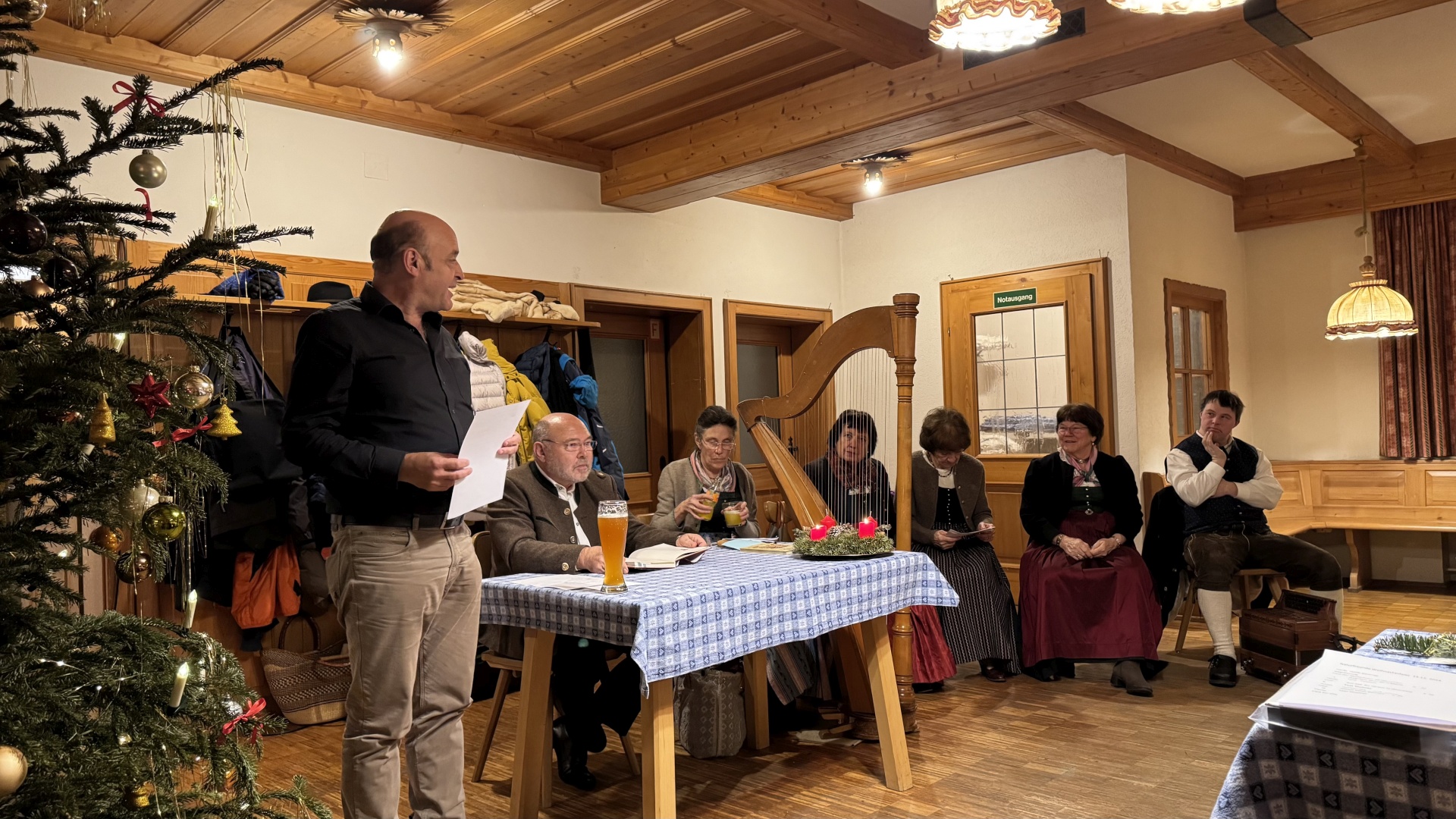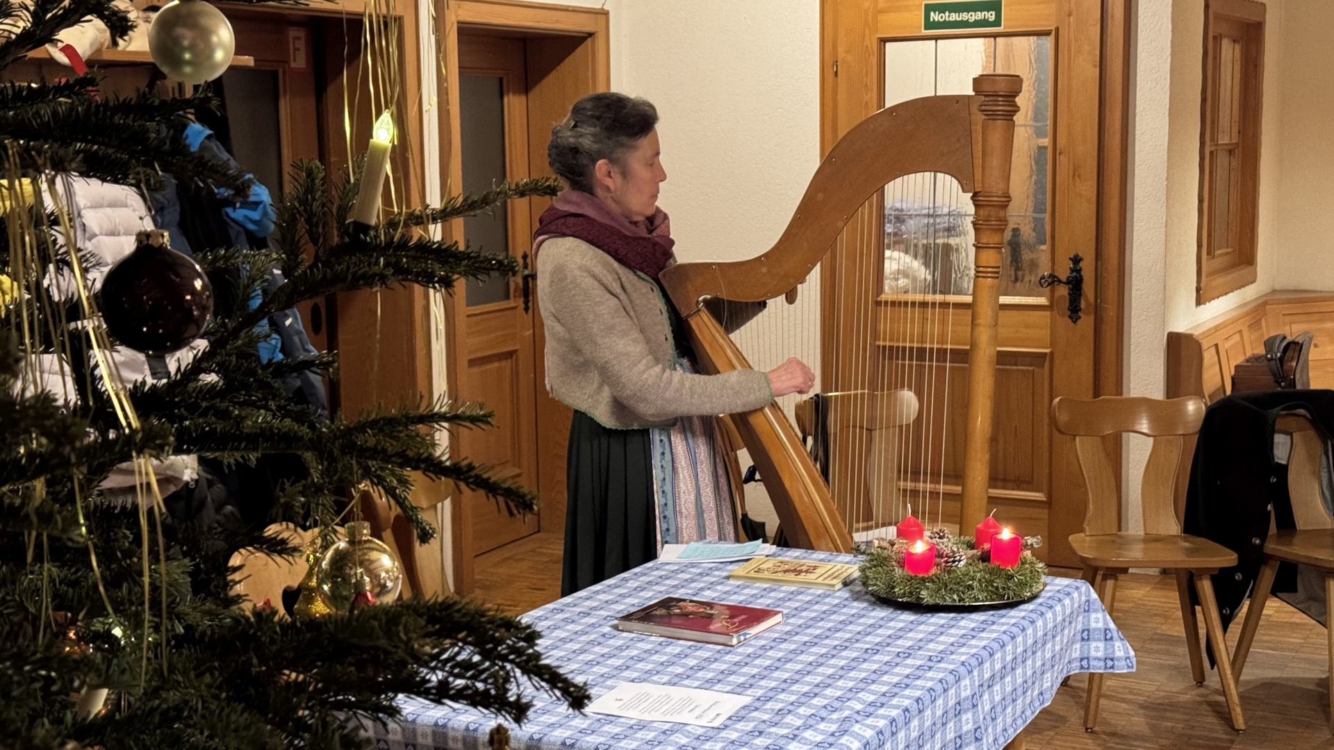 Nach gutem Essen (von Kürbissuppe über Schweinsbraten und Zander bis zum Schokoparfait) haben uns die Waldramer Sängerinnen wieder mit weihnachtlichen Stücken erfreut, begleitet von Heidi Gantner auf der Harfe und Anian mit dem Akkordeon. Abwechselnd dazu hat Thomas bayerische Weihnachtsweisen und G‘schichten aus der Region vorgetragen.